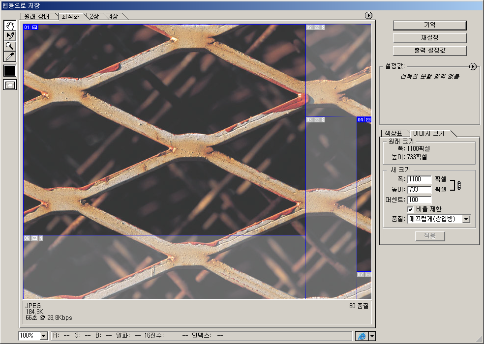 * 모뎀~ADSL처럼 당시 속도가 들쑥날쑥했던 인터넷 환경을 고려하여 웹 그래픽 작성 기능이 개선 및 향상되었다. GIF 및 JPEG 압축 최적화 기능이 강화되었으며, 분할 영역 도구로 이리저리 그어주면 알아서 분할시켜주고 HTML 형식으로 만들어준다.